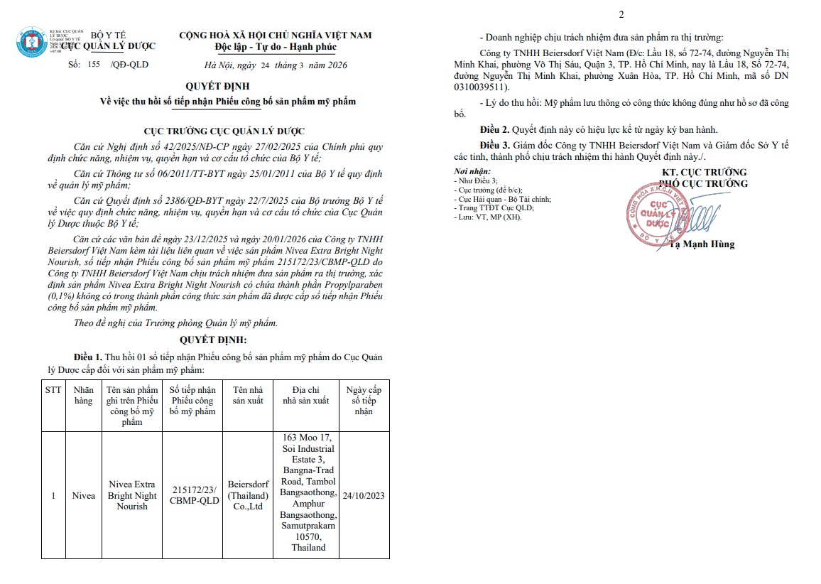 Theo Quyết định số 155/QĐ-QLD ngày 24/3/2026, Cục Quản lý Dược quyết định thu hồi 1 phiếu công bố sản phẩm mỹ phẩm do Cục quản lý Dược cấp đối với nhãn hàng Nivea, tên ghi trên phiếu công bố mỹ phẩm là Nivea Extra Bright NightNourish.