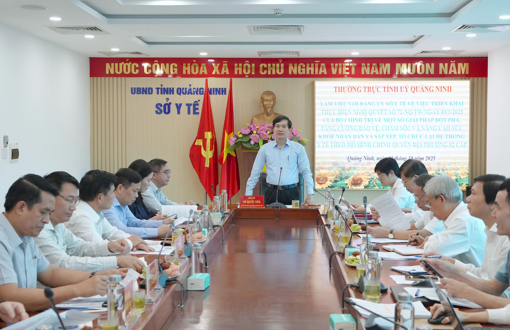 Phát biểu chỉ đạo tại buổi làm việc, đồng chí Vũ Quyết Tiến ghi nhận và biểu dương nỗ lực của ngành Y tế trong triển khai Nghị quyết 72-NQ/TW cũng như công tác chuẩn bị sắp xếp hệ thống y tế theo mô hình chính quyền 2 cấp. Đồng chí nhấn mạnh, đây là bước đi mang tính chiến lược, tạo nền tảng cho sự phát triển toàn diện, hiện đại và bền vững của ngành Y tế Quảng Ninh trong giai đoạn mới.