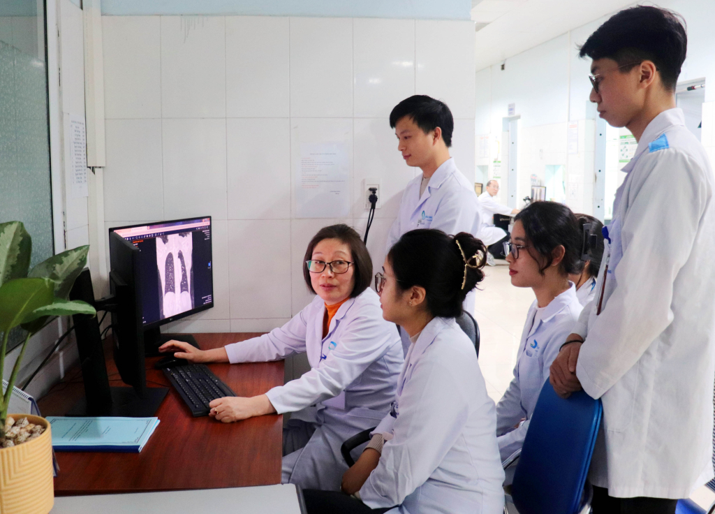 Bác sĩ Đoàn Thị Huệ, Trưởng Khoa Chẩn đoán hình ảnh hướng dẫn trực tiếp bác sĩ trẻ đọc phim ở Khoa Chẩn đoán hình ảnh, Bệnh viện Bãi Cháy. Ảnh: cơ sở cung cấp
