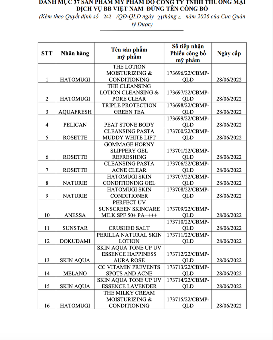 Cục Quản lý Dược, Bộ Y tế đã có văn bản xử phạt vi phạm hành chính Công ty TNHH Thương mại Dịch vụ BB Việt Nam (trụ sở tại Hà Nội) 75 triệu đồng và buộc thu hồi, tiêu huỷ 37 sản phẩm mỹ phẩm do doanh nghiệp đứng tên công bố.