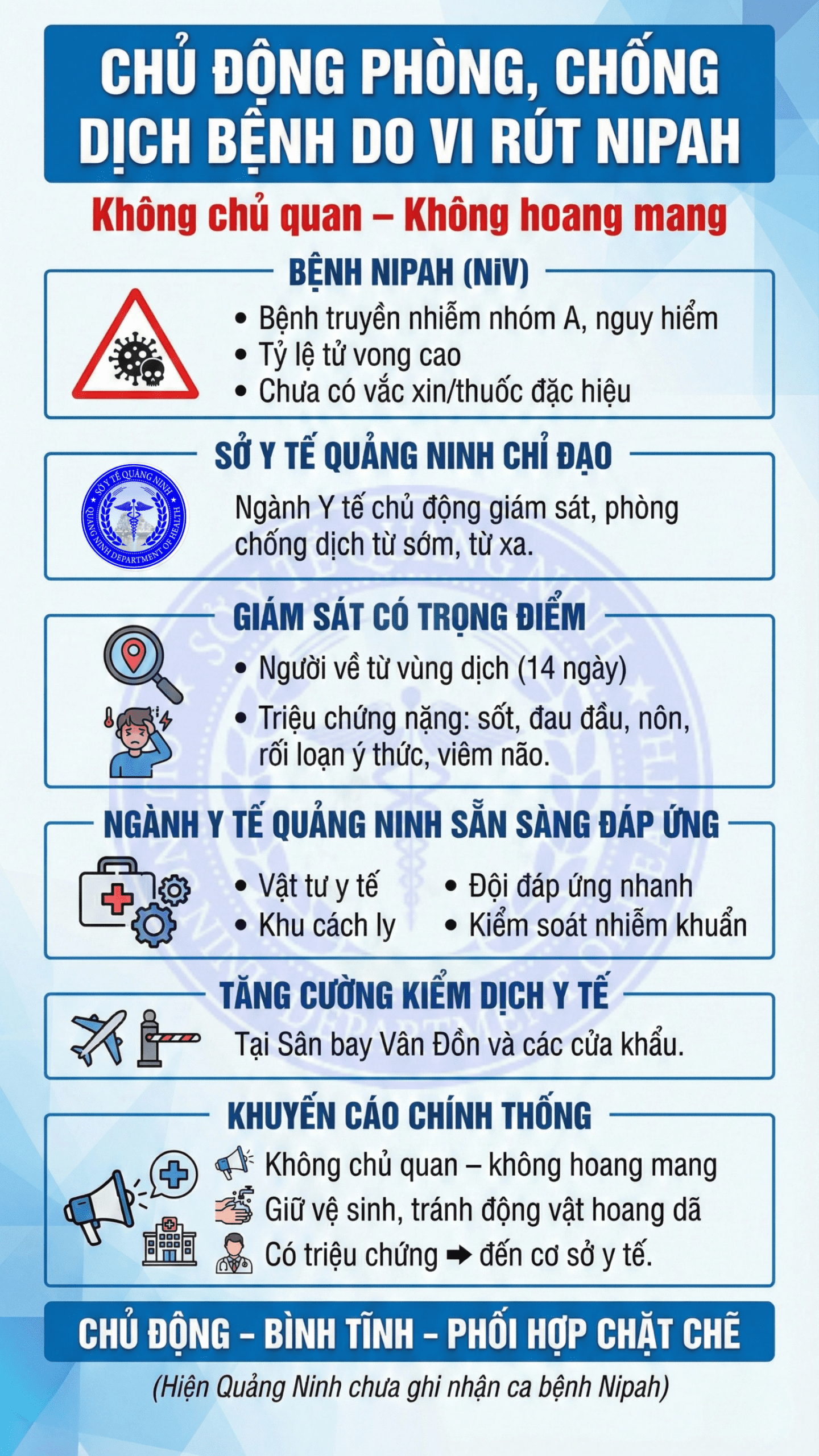 Phòng, chống dịch bệnh là trách nhiệm của cả hệ thống chính trị và mỗi người dân. Chủ động – Bình tĩnh – Phối hợp chặt chẽ là thông điệp xuyên suốt được Ngành Y tế Quảng Ninh nhấn mạnh, nhằm kiểm soát hiệu quả bệnh do vi rút Nipah và các dịch bệnh truyền nhiễm nguy hiểm khác.