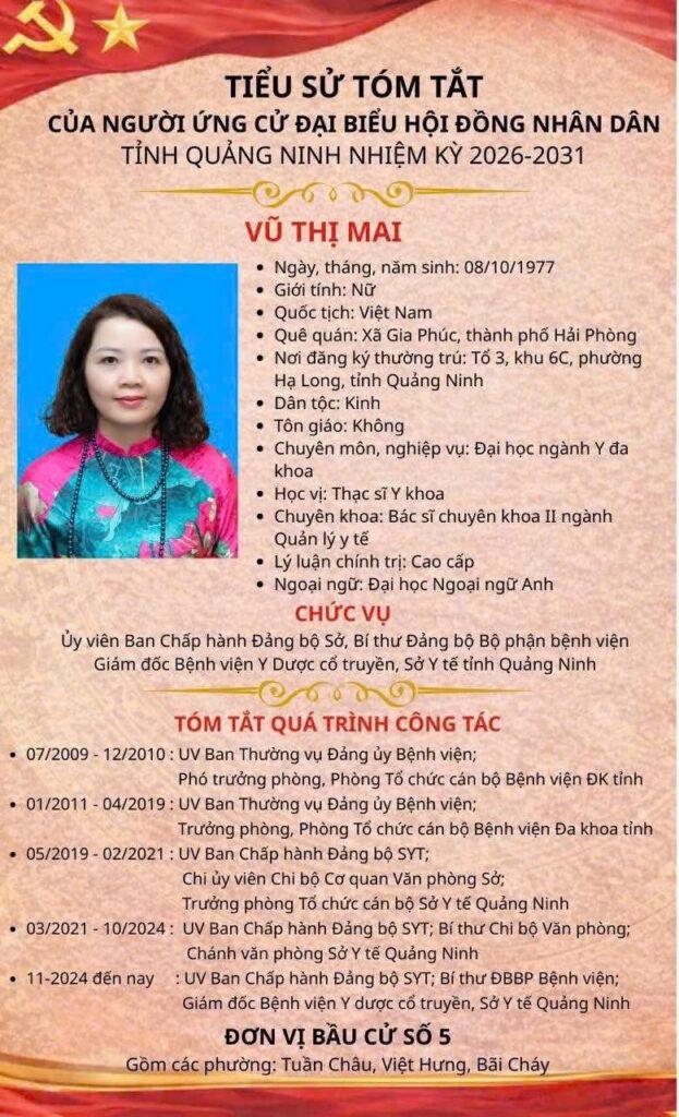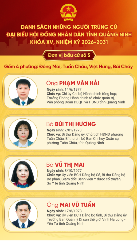 Ngày 17/3, Ủy ban Bầu cử tỉnh Quảng Ninh ban hành Nghị quyết số 161 và Thông báo số 163 về việc công bố kết quả bầu cử và danh sách những người trúng cử đại biểu HĐND tỉnh khóa XV, nhiệm kỳ 2026 – 2031. Trong danh sách này, Đảng bộ Sở Y tế có đồng chí Vũ Thị Mai – Ủy viên BCH Đảng bộ Sở, Bí thư Đảng bộ bộ phận, Giám đốc Bệnh viện Y Dược cổ truyền tỉnh đã xuất sắc trúng cử.